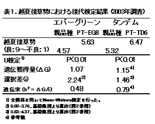 2003年における後代検定の結果、EGから選抜した8個体の多交配後代(PT-EG8)とTDとパウリタから選抜した8個体によるTD由来の多交配後代6母系(PT-TD6)における平均値は5.63と6.47であり、同年における親品種の越夏後草勢(EG平均値:4.57及びTD平均値:5.32)と比べて有意差が認められる(表1)。また、これらの数値より推定される越夏性の遺伝率(h2)は、それぞれ0.48及び0.79(参考値)である(表1)。 |