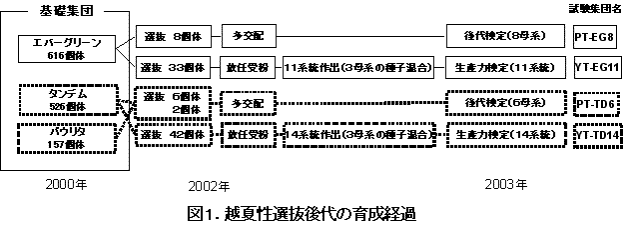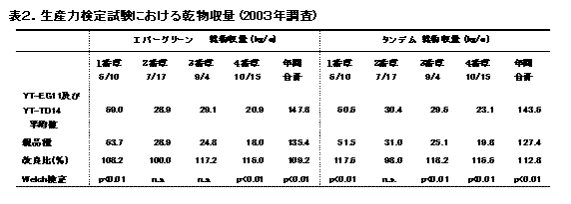 2001年において越夏後草勢により選抜した個体(EG平均値:5.58及びTD平均値:5.62)で放任受粉させ、EG11系統(YT-EG11)及びTD14系統(YT-TD14)を作出して生産力検定を行った結果、選抜系統は親品種と比較して、2003年の越夏後収量(3及び4番草)が有意に高く、選抜効果が認められる(表2)。また、1番草の収量は減少していないことから、越夏性と初期生長性は独立した選抜が可能である。 |