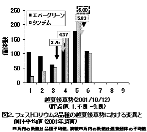 越夏性選抜後代の育成経過を図1に示す。試験に用いた品種エバーグリーン(EG)とタンデム(TD)の基礎集団における2001年の越夏後草勢(評点値、良:9〜不良:1)は、枯死(評点1)及び極めて生育不良(評点2)の個体をそれぞれ29%及び10%含むなど変異が大きい。なお、品種の平均値は、EG及びTDにおいてそれぞれ3.76及び4.73であるが、後代検定で用いる選抜個体の平均値はそれぞれ6.00及び5.83となり、1ポイント以上の選抜が可能である(図2)。 |
