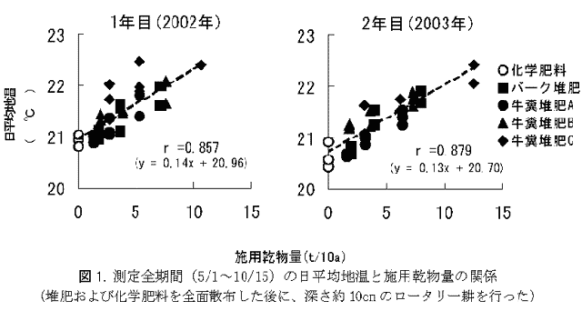 施用される堆肥の乾物量が多いほど地温の上昇程度は大きくなる。また、施用乾物量と日平均地温との間に高い相関関係が認められる。(図1)。 |