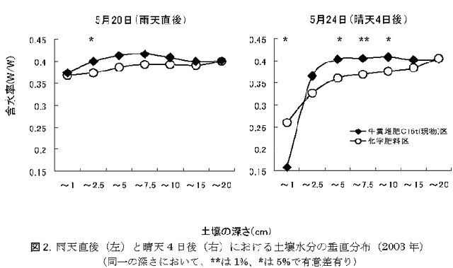 降雨直後における土壌水分の垂直分布は、牛糞堆肥16t(現物)区と化学肥料区でほぼ同様の傾向を示す。一方、晴天が続くことにより、表層1cmまでの水分は堆肥区で極端に低下するのに対し、1cmより下層では化学肥料区で大きな水分の低下が認められる(図2)。すなわち、堆肥施用により毛管連絡が阻害され蒸発が抑制され、表層での潜熱伝導が小さくなることが地温上昇の要因の一つと考えられる。 |