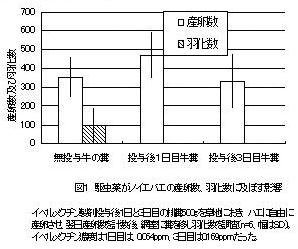 ノイエバエの産卵数は、イベルメクチン製剤をポアオン処理(イベルメクチンとして500μg/牛重1kg)した牛の糞と無処理牛の糞で差はなかった(Kruskal-Wallis test、p>0.19)。しかし、駆虫薬処理後、1日および3日目の牛の糞に産卵された卵は羽化には至らない(図1)。 |