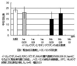 ノイエバエの羽化数は、糞内のイベルメクチン濃度が0.001ppmになるように駆虫薬を添加した糞と対照糞では差がないが、0.01ppm以上添加した糞では全く羽化しない。モキシデクチンでは、0.01ppmでは対照糞と差はなく、0.1ppmで羽化は完全に抑えられる(図2)。 |