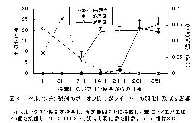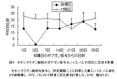 放牧牛にイベルメクチン製剤とモキシデクチン製剤(モキシデクチンとして500μg/牛重1kg)をポアオン法で投与し、その1〜35日後の所定日に排泄された糞にノイエバエ卵を接種すると、イベルメクチンでは投与後14日目までの糞(糞内イベルメクチン濃度、0.0079ppm以上)では全く羽化が見られず、21日目の糞(同、0.0034ppm)でも生育は阻害されるが、28日後には回復する(図3)。モキシデクチンでは3日目だけは強く阻害されるが、それ以外の期間では生育阻害は見られない(図4)。 |