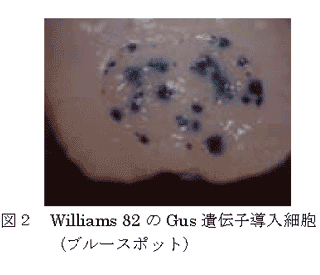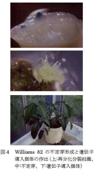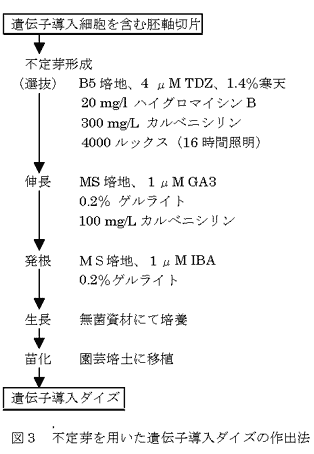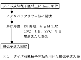 | ダイズの成熟種子胚軸の茎頂分裂組織周辺部および胚軸切断面の表皮細胞周辺部において、アグロバクテリウムを用いることにより、遺伝子導入細胞を得ることができる。それらの細胞から不定芽を経て遺伝子導入ダイズの再分化が可能である。 | |