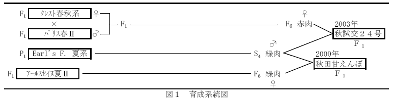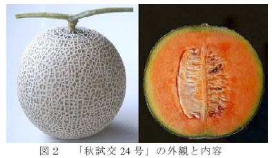 「秋試交24号」はアールス系メロンと純系アールスのF1である。母本は「クレスト春秋系」に「パリス春II」を交配し、その後代を選抜固定したアールス系で、果肉が橙色で果実外観と日持ち性に優れ、うどんこ病に強く、つる割病の抵抗性を保持している。父本は「秋田甘えんぼ」と同じく、純系アールスの一品種「Earl's F.夏系」の選抜固定系統で、極めて食味が良い(図1)。 |