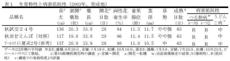 病害抵抗性は、「秋田甘えんぼ」と同様に、つる割病(レース0、レース2)に抵抗性で接ぎ木が不要であり、うどんこ病に対しては中程度の抵抗性を示す(表1)。 |