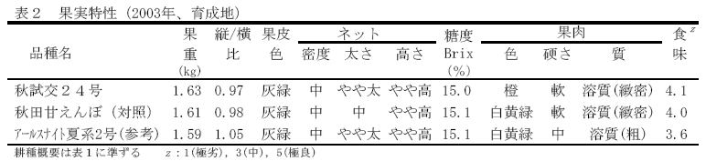 果実内容特性は、果肉が橙色で、肉質が緻密な溶質で純系アールスに極めて近く、食味が良い(表2、図2)。 |