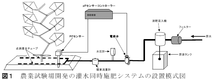 本システムは、液肥混入機により設定した一定濃度(EC値)の液肥を点滴灌水する方式で、液肥の供給をpFセンサーで自動制御する(図1)。なお、pF値の設定は、灌水始点(pF)2.0、灌水止点(pF)1.8とする。 |
