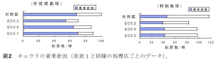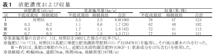 本システムで供給する液肥濃度は、対照区と収量性を考慮すると半促成栽培が0.7dS/m、抑制栽培は0.5dS/mが適当である(表1)。 |