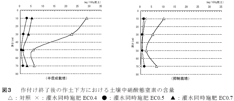 栽培終了後に土壌に残存する硝酸態窒素は対照区に比べ少なく、環境負荷軽減に有効な栽培法である(図3)。 |