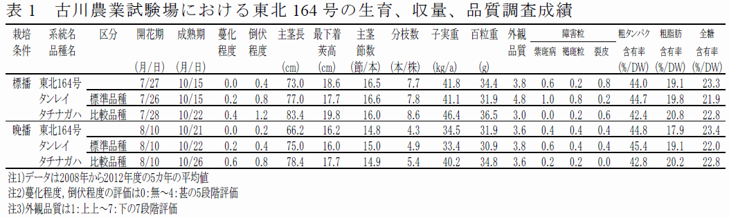 「東北164号」は「タンレイ」と同じ中生で収量が同程度であるが、百粒重、品質、耐倒伏性が優れる。「タンレイ」よりダイズモザイク病に強く、現地では紫斑病に強い傾向が認められる。加工適性は「タンレイ」と同程度である。よって、宮城県の奨励品種に採用する。