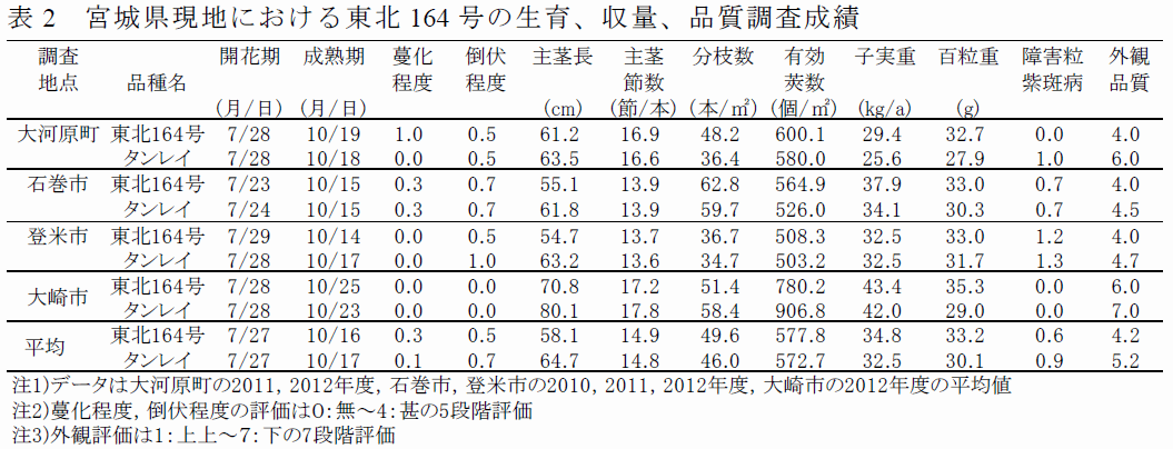- 「東北164 号」の開花期、成熟期は「タンレイ」とほぼ同じで宮城県では”中生”である(表1、2)。