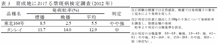 - ダイズモザイクウイルス抵抗性は”強”(育成地データ)で、紫斑病抵抗性は現地では「タンレイ」よりやや強い傾向が認められる。(表1、2、3)。