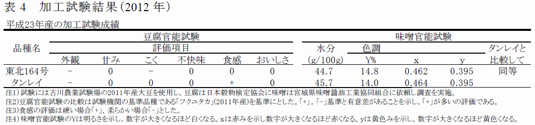 - 豆腐加工適性、味噌加工適性は「タンレイ」と同程度である(表4)。