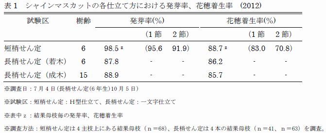 - 本品種の短梢せん定における第1、2節位の発芽率、花穂着生率は長梢せん定と同等であり、短梢せん定に適する(表1)。