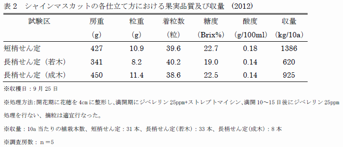 - 短梢せん定の単位面積当たりの収量は長梢せん定に比較して高い(表2)。