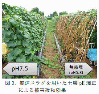 - 病原菌が検出された露地キュウリ圃場で軽度の萎凋症状が確認されている場合には、転炉スラグにより土壌pHを7.5に矯正して防除する(図1、図3)。ただし、病原菌に対する殺菌効果は認められず、激発圃場では土壌消毒と比較して防除効果が劣る場合がある(データ省略)。したがって、以前に著しい萎凋症状の発生が確認された圃場ではクロルピクリン剤によるマルチ畦内土壌消毒を行う(図1)。