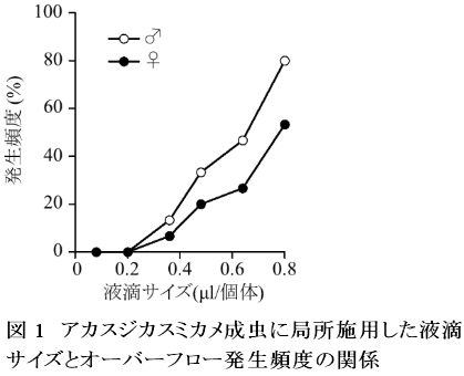 - 図1の試験では,発色試薬としてブロモフェノールブルーを加えたアセトンをろ紙上に置いた成虫に局所施用し,ろ紙に黄色汚点が現れた場合をオーバーフローと判断した。