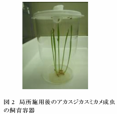 - 表1の試験では2009年に千葉県香取市で採集した個体群を累代飼育し,羽化後4〜10日の雌雄成虫を1濃度当たり30頭供試し,薬液濃度は4段階とした。図1および表2の試験は2009年に宮城県大崎市で採集した個体群を累代飼育し,図1では羽化後7〜10日の雌雄成虫を各液滴サイズ当たり15頭供試した。表2では1濃度あたり10頭×3反復供試し,薬液濃度は5段階とした。累代飼育では餌植物としてコムギ幼苗を,産卵基質としてアワ幼苗を与えた。処理後はコムギ幼苗を入れた透明プラスチック容器(直径5cm,高さ10cm)で飼育した(図2)。飼育時の温度は25度C,日長条件は16L8Dとした。