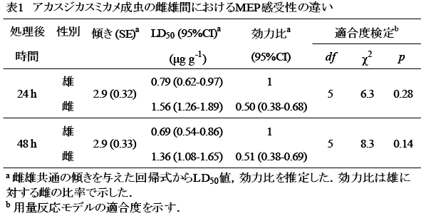 - 雌成虫は雄成虫に比べて薬液のオーバーフローの発生頻度が低く,薬剤感受性は雌雄間に約2倍の差が認められる(図1,表1)。供試虫に雌雄が混在すると実験誤差が大きくなると考えられるので,供試虫は雌成虫のみを用いる。