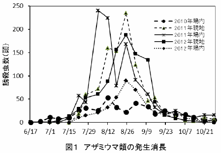 - 施設食用ぎく栽培におけるアザミウマ類のハウス内への侵入数は、7月下旬に急増し、8月下旬にかけ比較的多い状況が続き、その後急速に減少する(図1)。