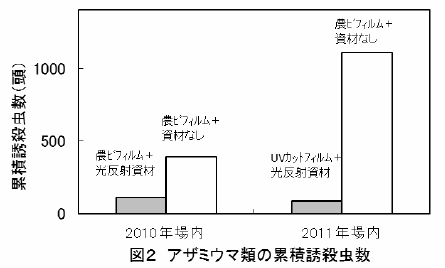 - 紫外線カットフィルムをハウス外張りへ使用し、光反射資材を織り込んだ防虫網「スリムホワイト45」をハウス開口部に展張することにより、アザミウマ類のハウス内への侵入数を抑制することができる(図2)。