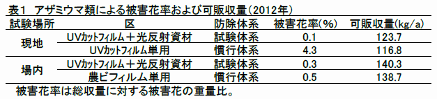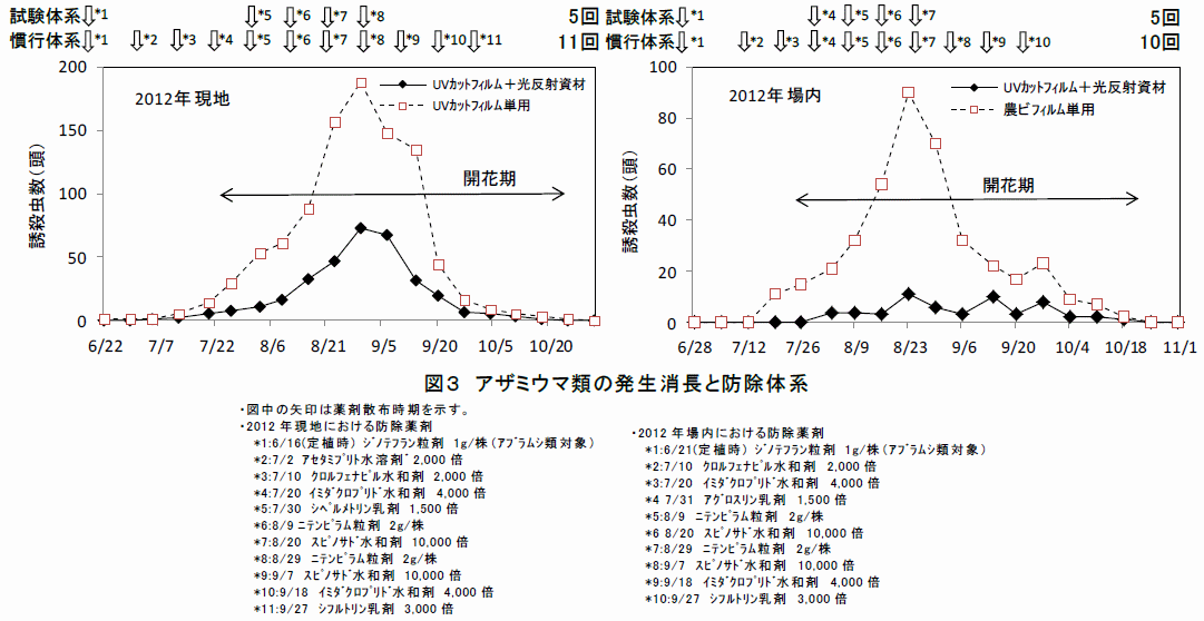 食用ぎく栽培においてアザミウマ類の発生が多く、収穫物への被害も大きくなっている。発生期間が長いことから定期的な薬剤散布が必要であるにもかかわらず、収穫前日までに使用できる薬剤が1剤のみと限られていることから、収穫物への被害が大きくなっている。また、現地では紫外線カットフィルムが慣行として導入されているが、被害を抑えるには至っていない。