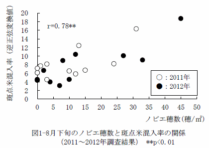 - 水田内のノビエ穂数が8月中旬以降に増加する条件下において、8月下旬のノビエ穂数と斑点米混入率の間には有意な正の相関が認められ(図1)、ノビエ穂数の増加に伴い側部加害主体(2011年:88.7%、2012年:96.7%)の斑点米が増加する。