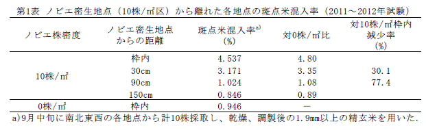 - 30、90cm地点の斑点米混入率は、ノビエ密生地(10株/平方メートル区)に比べてそれぞれ30.1%、77.4%減少する(表1)。