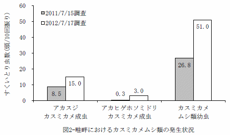 - 試験圃場の7月中旬の畦畔におけるすくい取り調査(10回振り)において,アカスジカスミカメ成虫とカスミカメムシ類幼虫が多く確認された(図2)。また、8月下旬に実施したノビエ密生地点(10株/平方メートル)枠内でのすくい取り調査(2回振り)において,両年ともアカスジカスミカメ成虫が4頭,カスミカメムシ類幼虫が2頭確認されたことから,斑点米の主要加害種はアカスジカスミカメであると推察された。