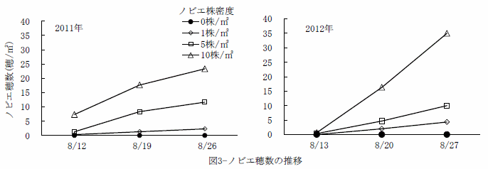 - 水田内のノビエ穂数が8月中旬以降に増加した条件下である(図3)。