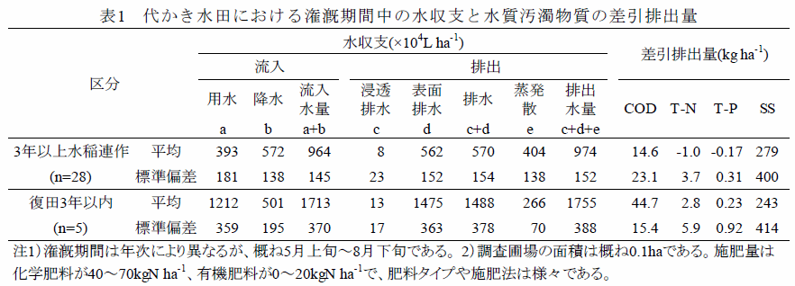 - 水稲を3年以上連作している代かき水田(連作水田)では、流入水量と排出水量がほぼ一致している。流入水量の約4割を用水が占め、約6割が排水として排出される。各汚濁物質の差引排出量は、全窒素(T-N)と全リン(T-P)がマイナスで水質浄化型、化学的酸素要求量(COD)と懸濁物質(SS)はプラスで水質負荷型である。これに対し、復田3年以内の代かき水田(復田)の場合、連作水田と比べて用水量が約3倍となり、流入水量が顕著に増加するだけでなく、SSを除く各汚濁物質の差引排出量も大幅に増加し、全て水質負荷型となっている(表1)。