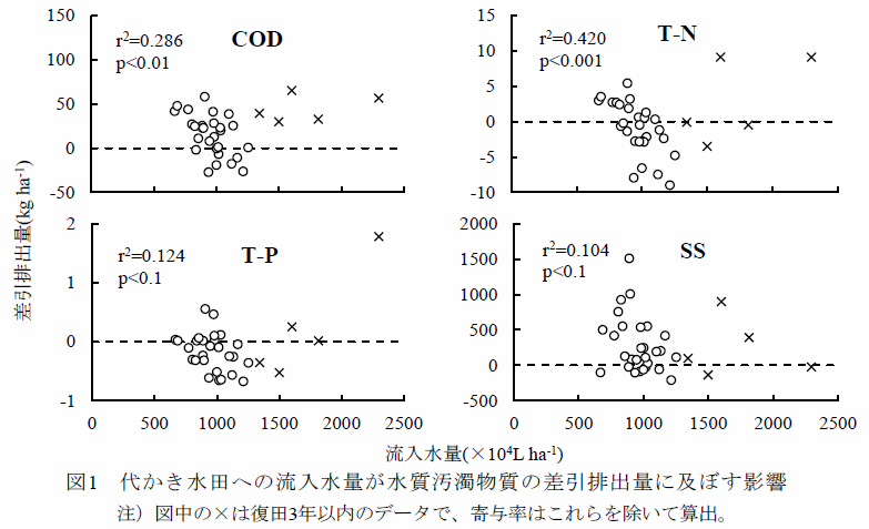 - 連作水田の場合、各汚濁物質の差引排出量は、水田への流入水量と負の相関が認められ、寄与率はSS<T-P<COD<T-Nの順に高い。これに対し、復田では差引排出量と流入水量に一定の関係が認められない(図1)。
