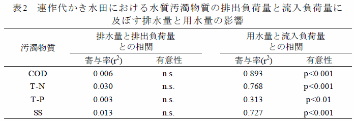 - 連作水田では、排水量と各汚濁物質の排出負荷量との間には有意な相関が認められないことから、排水量の増加は排出負荷量の増加につながらない。一方、各汚濁物質の水田への流入負荷量は用水量と有意な相関関係にあるため、用水量の増大は流入負荷の取り込みを増加させる(表2)。