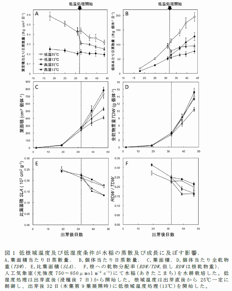 - 持続的な根域温度の低下は、蒸散量、葉面積拡大及び乾物生産を顕著に抑制し、その程度は低湿度条件でより大きいことから、吸水の抑制に起因した水ストレスが成長の抑制に関与している可能性が示唆される。
