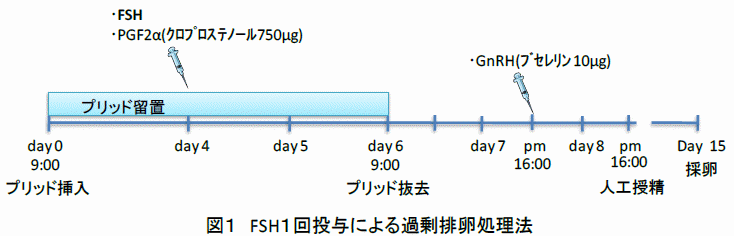 - FSHの投与は、PRID(膣内挿入型プロジェステロン・安息香酸エストラジオール配合剤)挿入(挿入日は、発情および発情直後を避ける)後4日目のドナーに頸部皮下へ1回のみ投与する(図1)。