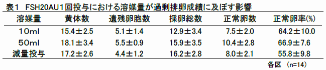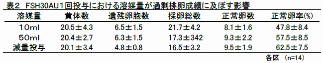 - 20または30AUのFSHを、10または50mlの生理食塩水に溶解し頸部皮下へ1回投与すると、いずれの条件においても減量投与と同様に過剰排卵誘起が可能である(表1、2)。