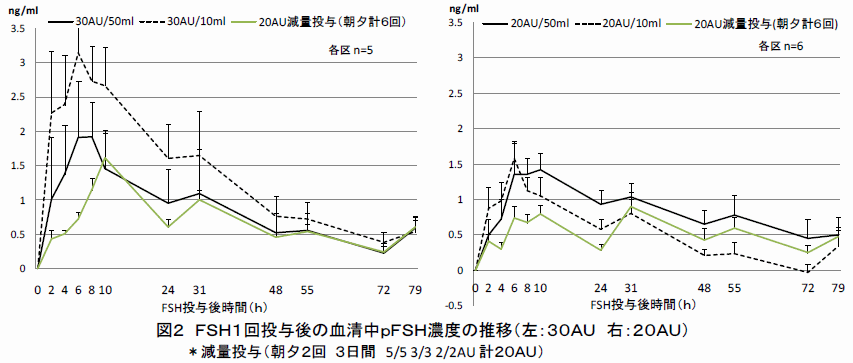 - FSH投与後の血中のFSH濃度の推移は、FSHの投与量30AUの場合、溶媒量10mlでは減量投与に比べ高く、50mlでは同等に推移する。低コストに結びつく20AUのFSHでは、溶媒量を50mlとすることで、血中のFSH濃度は減量投与法より低下することなく推移する(図2)。