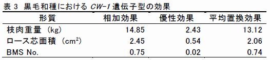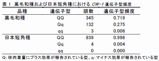 - CW-1は、岩手県内の黒毛和種、日本短角種集団ではプラス効果であるQ型の頻度が高く、QQ型の頻度は黒毛和種では0.719、日本短角種では0.996である(表1)。