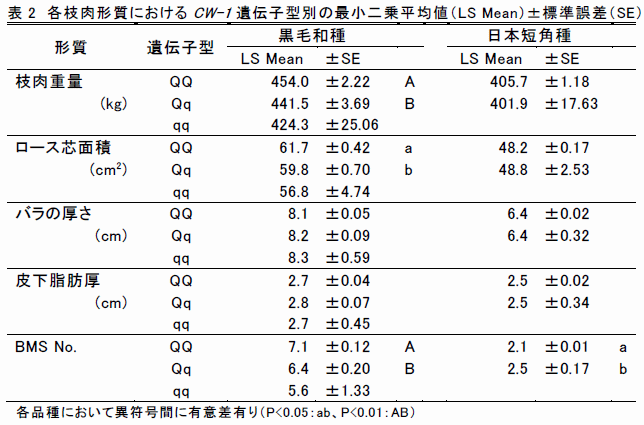 - 黒毛和種の枝肉重量およびロース芯面積で、QQ型はQq型よりも表型値が有意に大きいことからCW-1の遺伝子型は枝肉重量、ロース芯面積の改良マーカーとして利用可能である。さらに、BMSナンバーでも効果が認められる(表2、表3)。