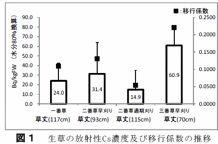 - 二番草の早刈りと適期刈りの放射性Cs 濃度を比較すると早刈りが高い傾向にある。牧草の適期刈りが早刈りの放射性Cs 濃度よりも低くなるのは、草丈が伸び全体的に希釈されるためと考えられる。また、生草(立毛)の放射性Cs 濃度及び移行係数は三番草早刈りが一番高い傾向にある(図1)。