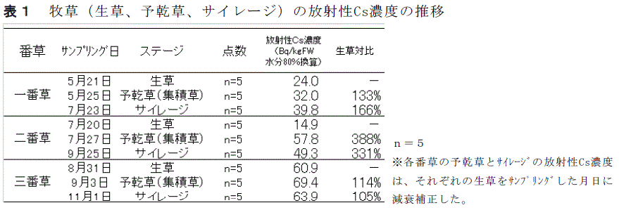 - 生草、予乾後(機械集草直後)及びサイレージの放射性Cs 濃度を比較すると、予乾後やサイレージが生草時よりも高くなる(表1)。二番草の予乾草やサイレージの放射性Cs濃度の生草対比が他の番草よりも特に高いのは、牧草刈取後に降雨が続き、刈取牧草を乾燥促進するヘイテッダによる反転回数が他の番草の収穫作業時よりも多く、土壌等の巻き込みが多かったことによるためと推察される。