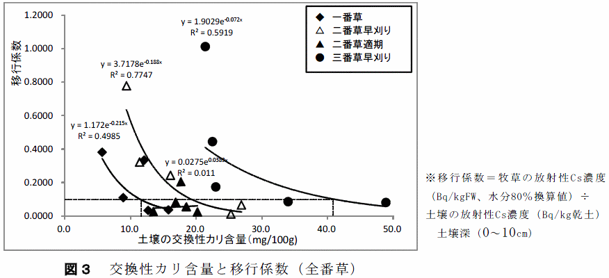 - 一番草から三番草までの土壌の交換性カリ含量と移行係数を見ると、各番草内では交換性カリ含量が高くなるほど移行係数が低くなる傾向にあり、かつ、番草を経るごとに交換性カリ含量は増える傾向にある。また、仮に移行係数を0.1 程度に抑制したいと想定すれば、一番草では交換性カリ含量が10mg/100g でも充分であるが、三番草では30mg 程度でも不充分であり、より精密な番草毎の肥培管理が必要であることが示唆される(図3)