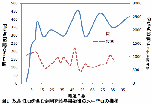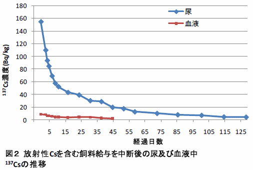 放射性Csを含む飼料を給与すると尿中137Csは数日間で急激に上昇し、その後は飼料中の137Cs濃度を反映し推移する。放射性Csを含む飼料の給与を中断すると、尿中137Csは中断直後の数日間と中断後43〜128日目の期間で異なる半減期で減少する。