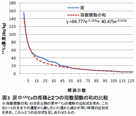 - 尿中137Csの推移は、2つの指数関数の和で近似することができる(図3)。