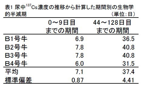 - 尿中137Cs は、放射性Csを含む飼料の給与を停止後間もない期間(0〜9日目まで)と給与停止44日目以降の期間で、異なる生物学的半減期で減少する(表1)。