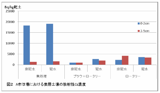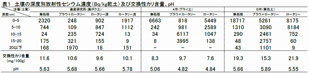 - 耕うんにより放射性Cs濃度の高い表層土壌が地中に埋め込まれるため、表層の濃度は低下する。プラウ耕では土壌が反転されることにより耕起深度の上層は低濃度となるが、ロータリー耕では耕起深内の土壌が均一に混和されることにより、表層から耕起深度までの濃度が一定となるため、土壌表層の放射性Cs濃度の低減効果はプラウ耕の方が高い(表1)。
