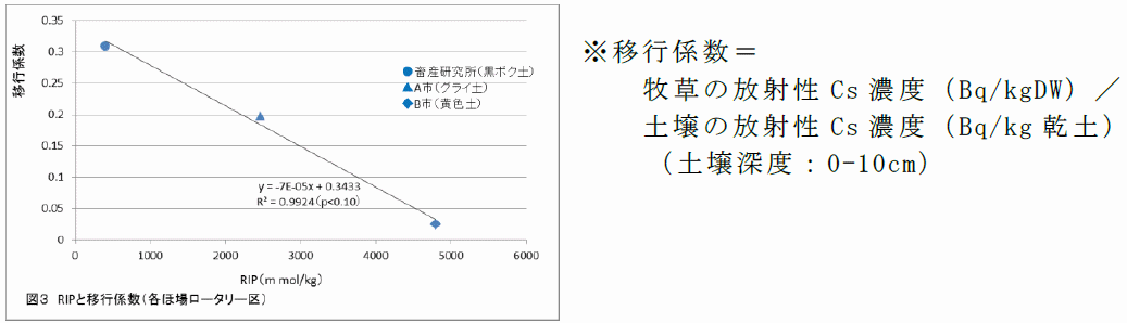 - 各ほ場のRIP(※)と移行係数を比較すると負の相関(相関係数=-0.996、p<0.10)が得られた。牧草への移行抑制には様々な要因が考えられるが、その中でも特にRIPの関与が大きいと推察される(図3)。