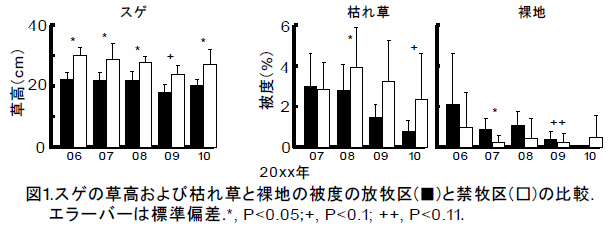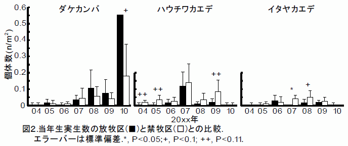 - 放牧は、草地内の優占種のスゲの草高と枯れ草の割合(被度)を減少させる一方、裸地を増加させる(図1)。これらにより、放牧は先駆種であり比較的小さい種子の陽樹のダケカンバの当年生実生数を多くし、陰樹のハウチワカエデとイタヤカエデの当年生実生数を少なくする(図2)。